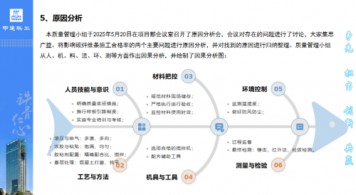 本次质量月最扎实的成果,莫过于我们针对施工难点编制的QC成果 《加强碳纤维粘贴一次合格率》 。碳纤维加固作为一项关键工序,其粘贴质量直接关系到结构安全。我们成立QC小组,遵循PDCA循环,通过现状调查、原因分析、要因确认、制定对策、对策实施、效果检查等一套科学严谨的程序,成功将一次合格率从活动前的90.5%提升至98.28%。这不仅仅是数字的提升,更是我们运用科学方法解决实际问题的能力飞跃。