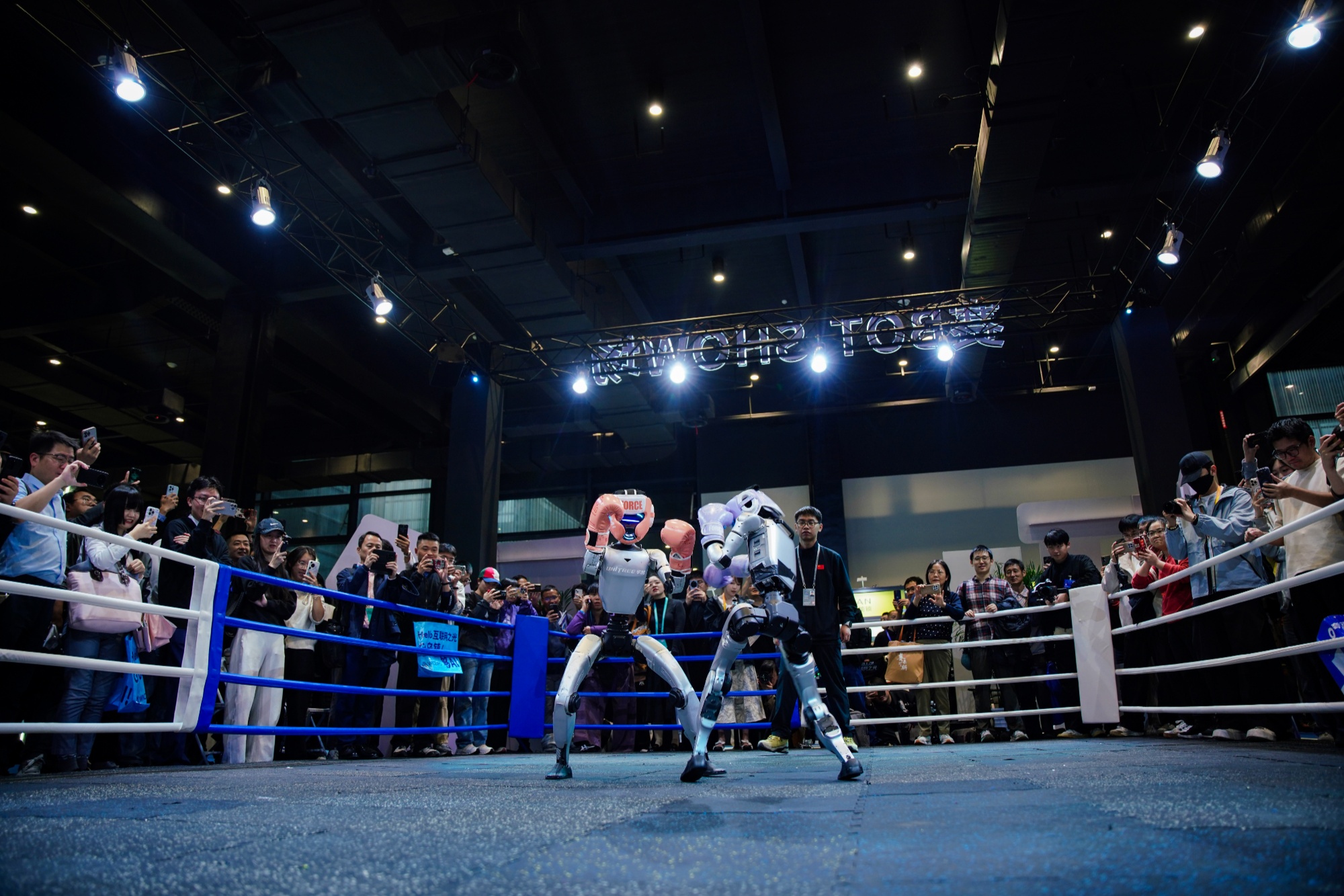 本届“互联网之光”博览会以具身智能、数智文旅等为主题打造了一个“超级体验馆”,展馆中央的“赛BOT SHOW场”吸睛无数,机器人格斗不时引来阵阵欢呼(央广网记者 尚天宇 摄)