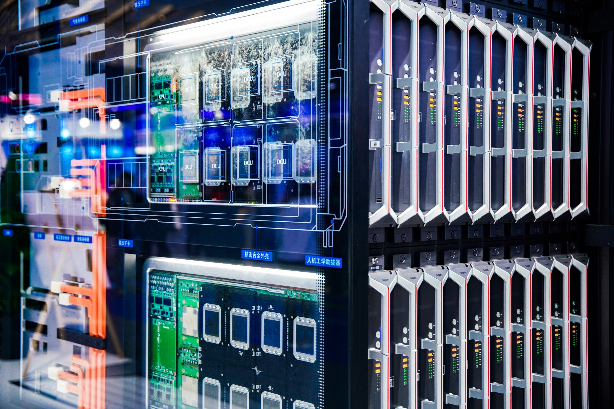 本届世界互联网大会期间,中科曙光正式推出全球首个单机柜支持640卡的超节点产品——scaleX640,并首次对外展示(央广网记者 尚天宇 摄)