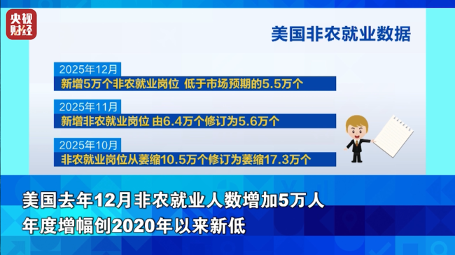 当地时间9日,美国劳工统计局公布的报告显示,美国2025年12月非农业部门就业人数增加5万人,低于预期,当月失业率从预期的4.5%降至4.4%,此前两个月的就业数据大幅下修了7.6万人,导致2025年全年非农就业人数创下2020年以来美国最疲软的年度就业增长数据。数据发布后,并未改变市场对美联储货币政策路径的预期,多家金融机构预测美联储2026年至少进行两次降息,每次降息25个基点。