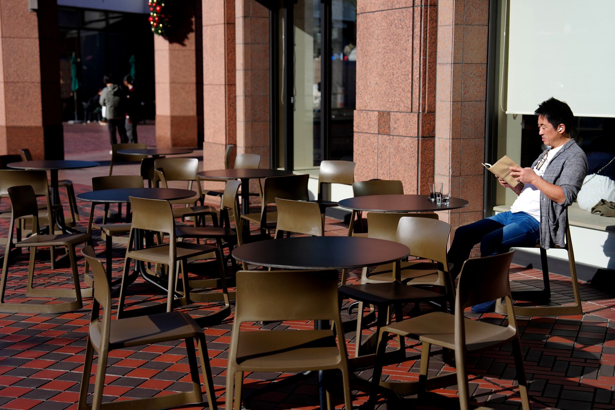 2025年11月17日,一名男子在日本东京的一家咖啡店外休憩。新华社记者贾浩成摄