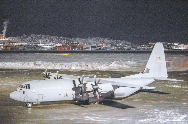 15日,丹麦皇家空军的一架C-130J运输机停靠在格陵兰岛的努克国际机场。该运输机前一天运载丹麦军事人员抵达该地。(视觉中国)