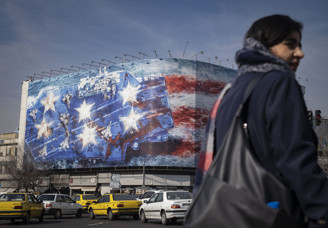 1月27日,伊朗德黑兰,恩格拉布广场巨型广告牌,伊朗警告美国不要试图对伊朗发动军事打击。(视觉中国)