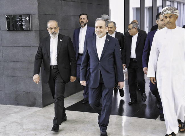 6日,阿曼首都马斯喀特,伊朗外交部长阿拉格齐(前排中)率团前往美伊谈判会场。(视觉中国)