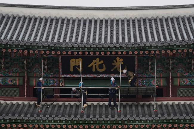 2025年12月16日,韩国首尔,工人们在景福宫正门光化门搭建脚手架并检查招牌。(视觉中国)