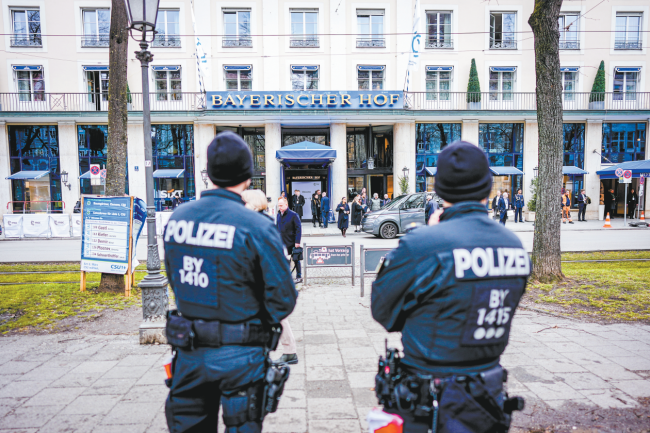 第62届慕尼黑安全会议13日在德国巴伐利亚州首府慕尼黑举行。图为当地时间12日,慕安会举办地巴伐利亚霍夫酒店外戒备森严。(视觉中国)