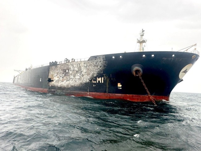 当地时间3月31日,悬挂科威特国旗的“塞勒米”号油轮在遭到袭击后受损。图源:英媒