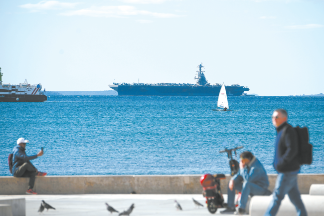 近日,美军“福特”号航母停靠克罗地亚斯普利特港进行维护保养。3月早些时候,“福特”号因舰上洗衣房失火撤离中东战区。(视觉中国)