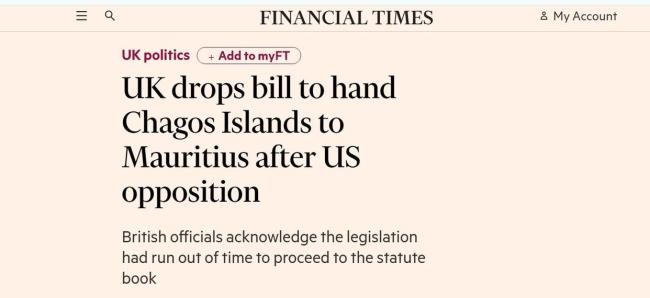 《金融时报》的报道还援引英国政府发言人的话说,英国只会在获得美国支持的情况下推进该协议,将继续与美国和毛里求斯开展磋商。