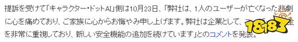 ·10月23日,被起诉的AI公司发表回应称,公司对于用户的死亡深感遗憾和伤悲,公司会继续重视用户的安全问题,继续追加更加严密的安全措施和功能。