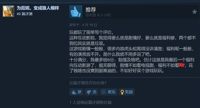 很显然事情没有那么简单,翻阅Steam评论区不难发现,最高频出现的词语就是“剧情”。几乎所有美女游戏,都在接受从剧情逻辑到人物塑造的文案审判,就连好评如潮的《学习》和开山元老《完蛋》,差评也集中于对剧情的不满。