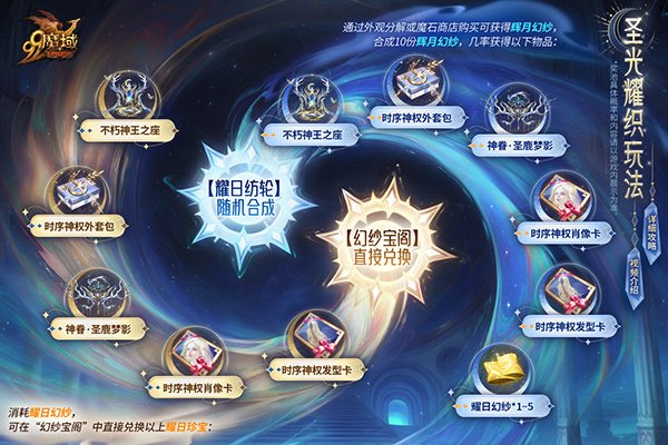 想要将年度臻品外观纳入收藏?全新“圣光耀织”玩法为您提供随机合成、指定兑换两种外观获取途径:“圣光耀织”包含初级烁星、中级辉月、高级耀日三类奖池,使用“星光织线”在“纺轮”中织线成纱,即可逐级合成“烁星幻纱”、“辉月幻纱”、“耀日幻纱”材料,在相应奖池的“宝阁”中可直接兑换指定珍品,将心之所好收入囊中;“纺轮”过程中还有机会获得该奖池内的随机外观,享受美从天降的鸿运时刻!