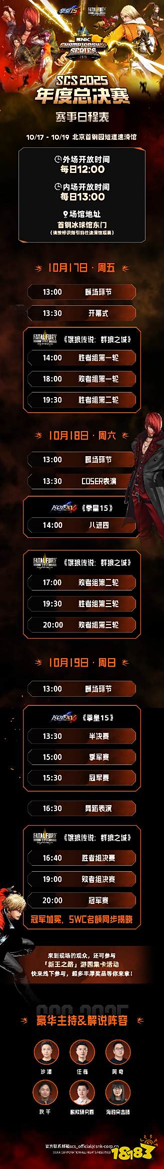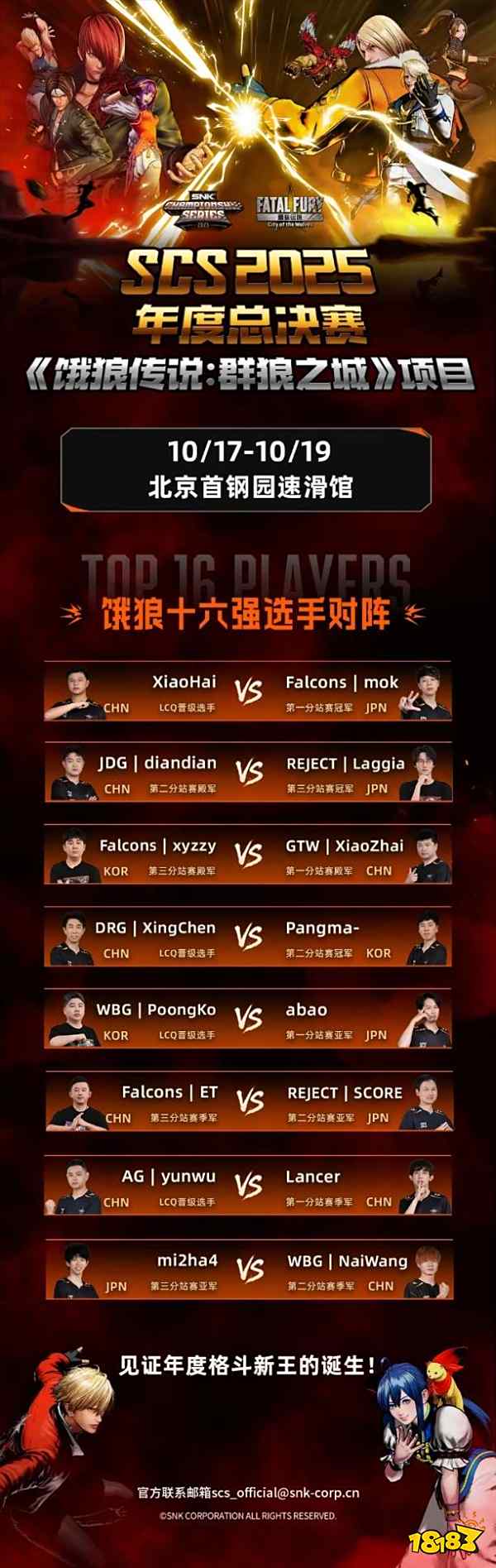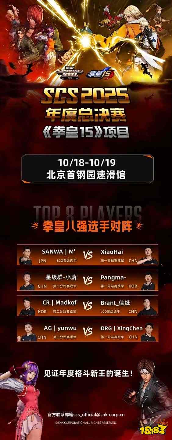 由株式会社SNK主办的SCS 2025(SNK冠军系列赛 2025)年度总决赛,将于10月17日至19日在北京首钢园举行。届时,将诞生《拳皇15》《饿狼传说:群狼之城》两大项目年度总冠军,并揭晓SWC 2025直通人选。