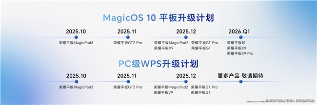 荣耀还公布了一系列持续回馈老用户的福利:购买荣耀MagicPad3 Pro最高配置可享300元升杯券;即刻起,将在多款平板机型中陆续升级MagicOS 10与PC级WPS功能。另外,2021年4月后发布的荣耀PC全系也将获得YOYO助理升级推送,双11期间购买荣耀笔记本,更有叠加国补最高省3000元的优惠福利。
