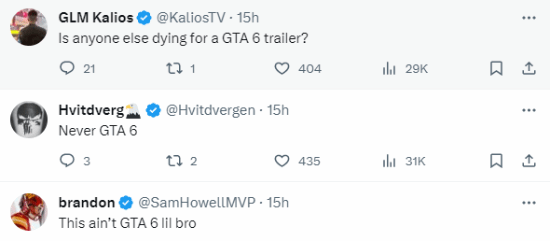 R星的官方推特评论区也早已被网友攻陷,其最新推文是昨晚为宣传《大镖客OL》活动发的,目前已有过千评论。其中相当一部分都是在“催更”《GTA6》,还有的在询问《大表哥2》的次世代版本。