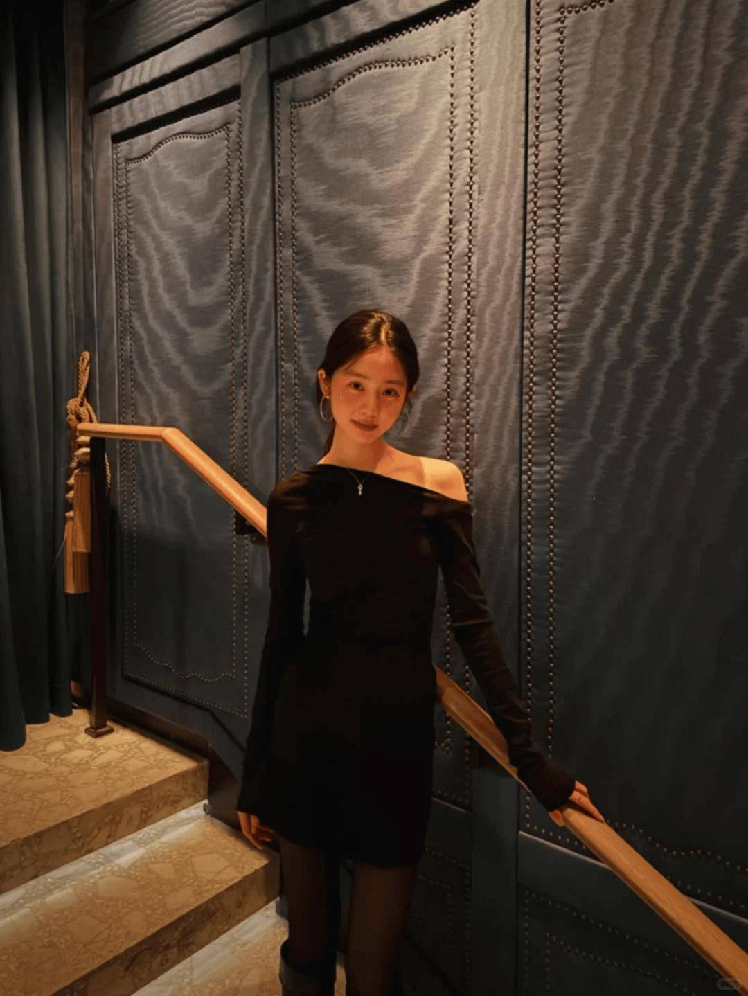 照片中,她身穿黑色露肩短裙,线条简洁利落,肩颈舒展,神态从容。低马尾与简约耳饰的搭配,让整体气质显得更清爽。