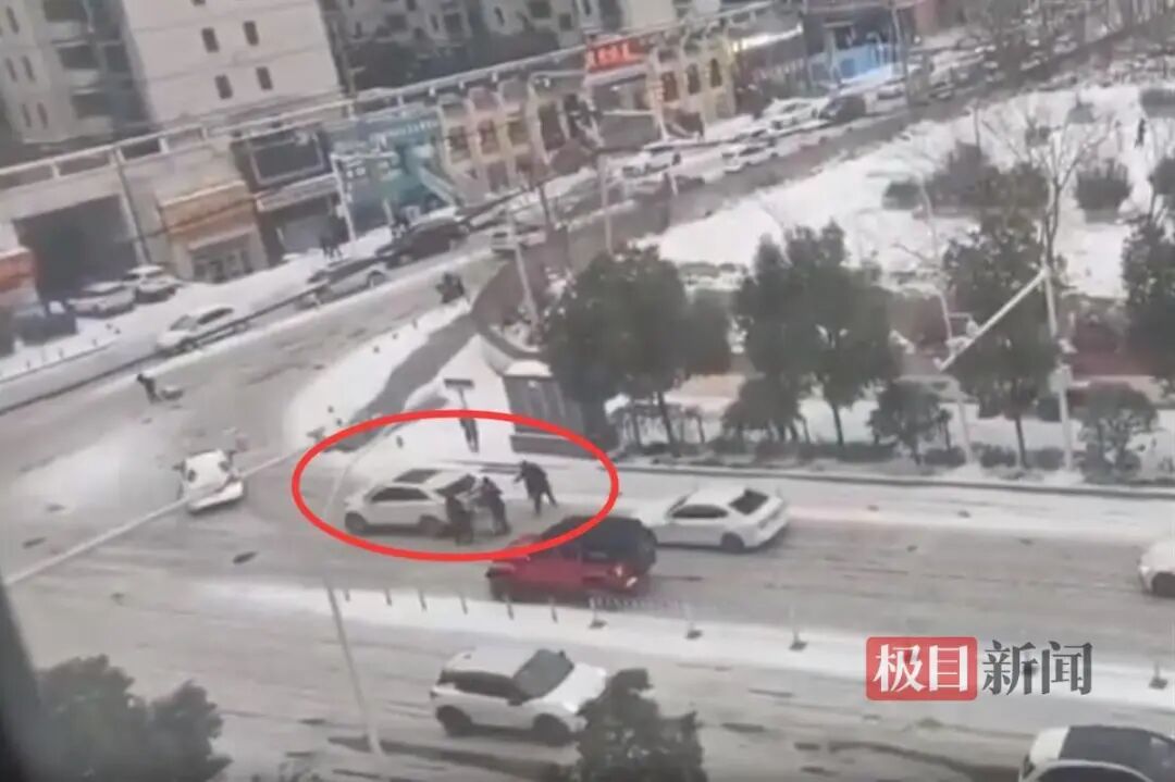 根据视频显示三人在雪地里来回穿梭与路人、司机一起帮助一辆辆打滑“趴窝”车辆脱困直到路灯亮起还在帮忙