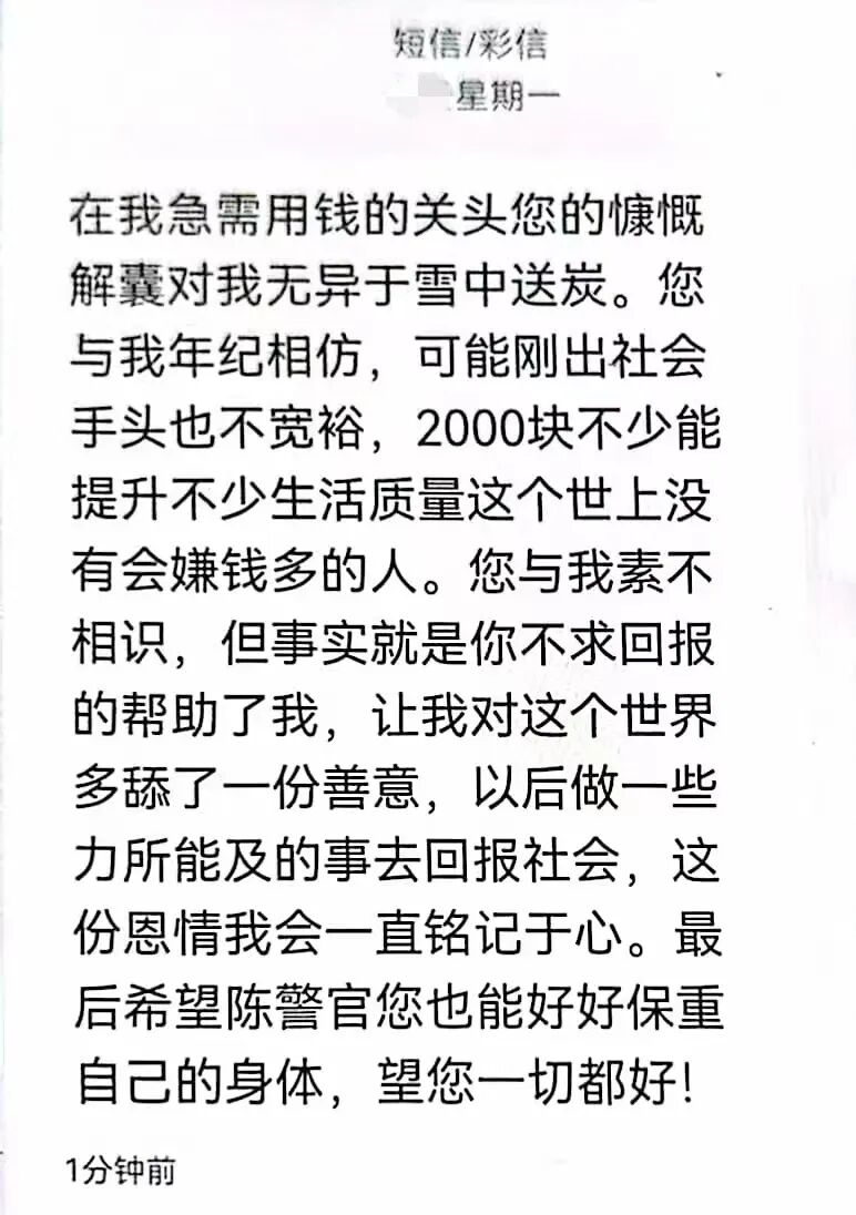 也给陈廷钊发来了感谢短信:“您与我素不相识不求回报帮助了我让我对这个世界多添了一份善意这份恩情我会一直铭记于心以后做一些力所能及的事情回报社会”