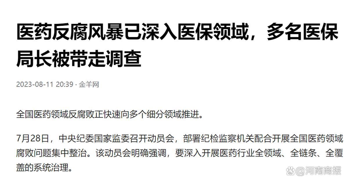 多名医保局长被带走调查,也就不奇怪,是医药行业治理“全领域、全链条、全覆盖”的体现,也是“一竿子插到底”的表现,无论涉及哪个环节,都会刮骨疗毒。