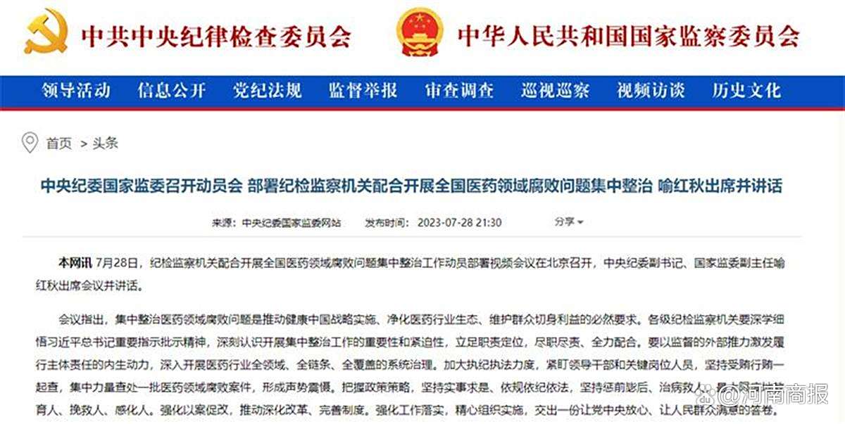 据中央纪委国家监委网站消息,7月28日,纪检监察机关配合开展全国医药领域腐败问题集中整治工作动员部署视频会议召开。会议提到,“深入开展医药行业全领域、全链条、全覆盖的系统治理”“紧盯领导干部和关键岗位人员,坚持受贿行贿一起查,集中力量查处一批医药领域腐败案件,形成声势震慑”。
